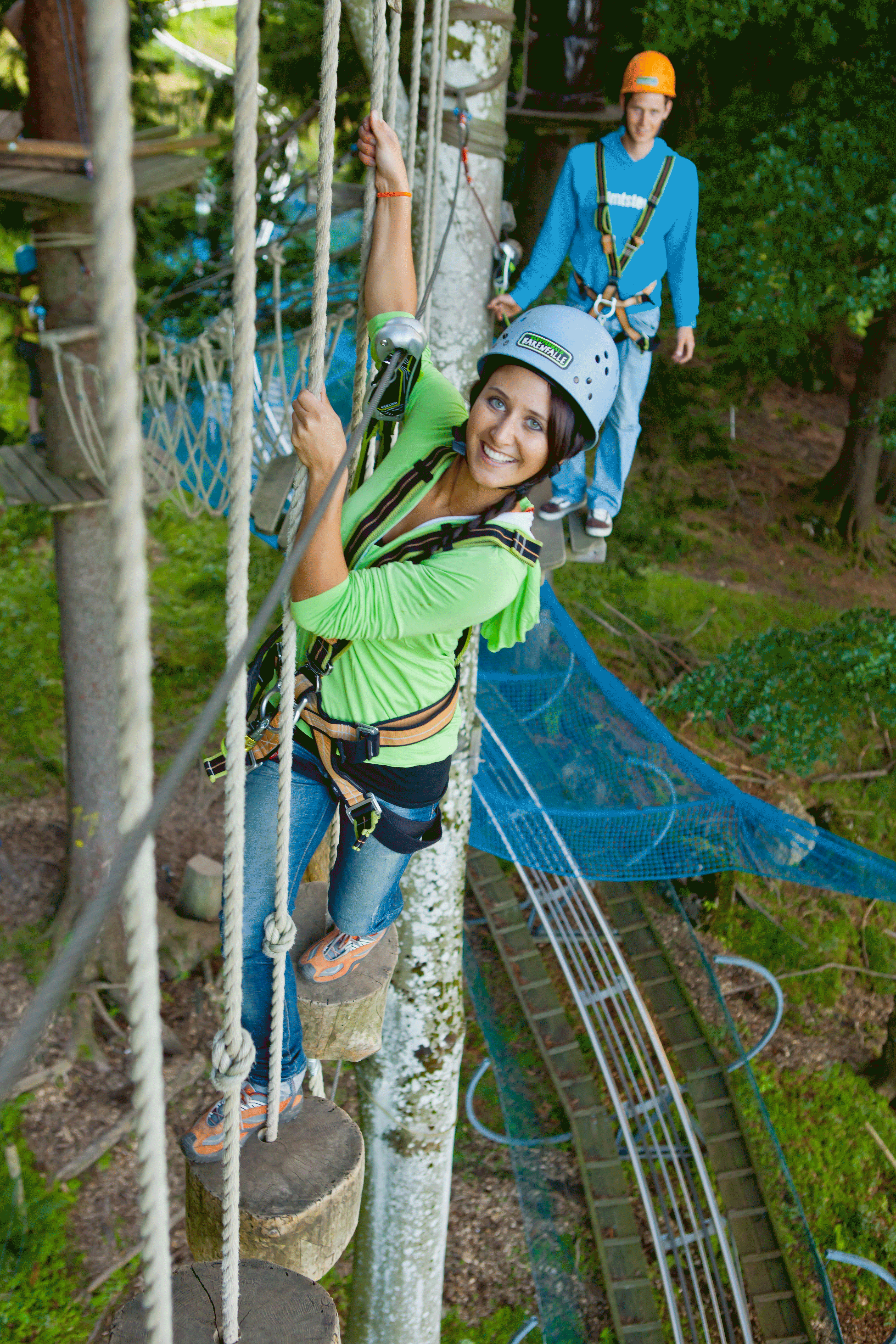 terwald Bärenfalle. 16 verschiedene Parcours bieten von einfachen Kletterelementen in Bodennähe, bis hin zu schweren Kletterstellen in 20 m Höhe alles, was den Puls ansteigen lässt.